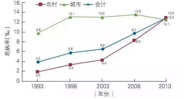 2017年6月,《中國心血管病報告2016》發(fā)布,報告概要刊登于中國循環(huán)雜志。國家衛(wèi)生服務調查結果顯示,1993~2013年期間,我國腦血管病患病率整體呈上升趨勢,以前是城市高于農村,但目前已經發(fā)生逆轉。2013年的第五次調查顯示,城市腦血管病患病率(12.1‰)有所下降,農村(12.3‰)仍呈明顯的上升。腦卒中現(xiàn)患人數約1300萬,腦卒中給中國造成的經濟負擔每年高達400億元。