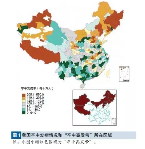 中國卒中帶 研究顯示,中國西北部九省市或自治區(qū)(黑龍江、西藏自治區(qū)、吉林、遼寧、新疆維吾爾自治區(qū)、河北、內蒙古自治區(qū)、北京及寧夏回族自治區(qū))的卒中發(fā)病率較高,構成中國卒中帶。卒中帶的卒中發(fā)病率為236.2/10萬,顯著高于卒中帶之外地區(qū)的發(fā)病率109.7/10萬。
